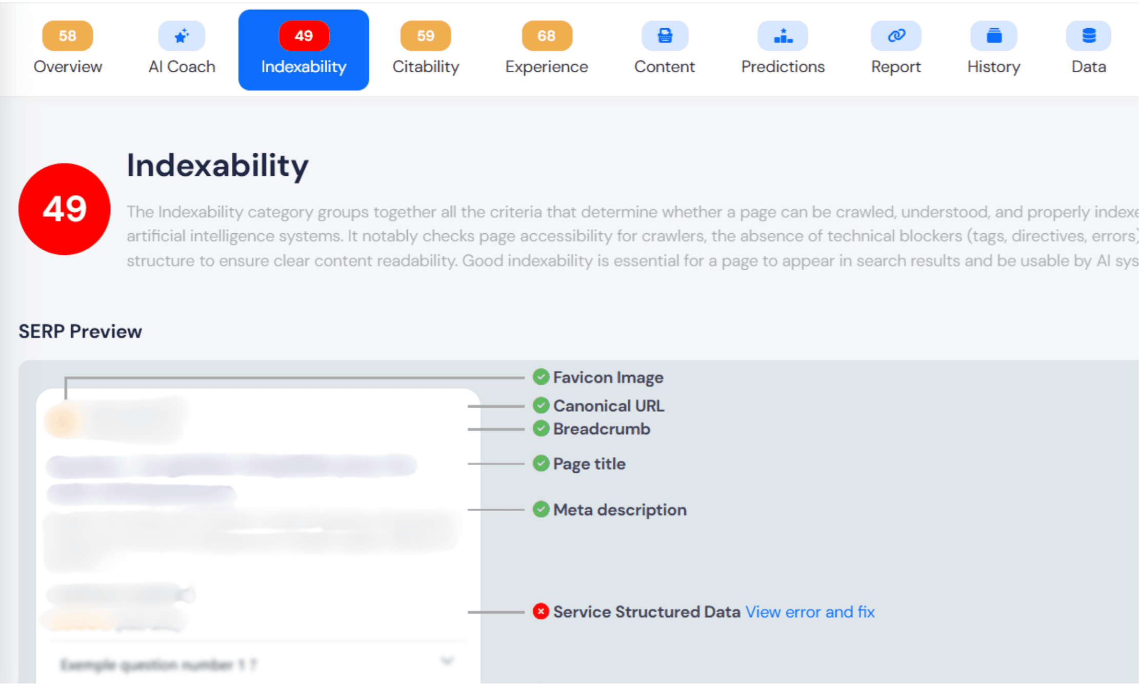 You also receive code snippets when relevant and tailored advice based on your CMS. Recommendations differ for Wix, Shopify, WordPress, and custom sites.